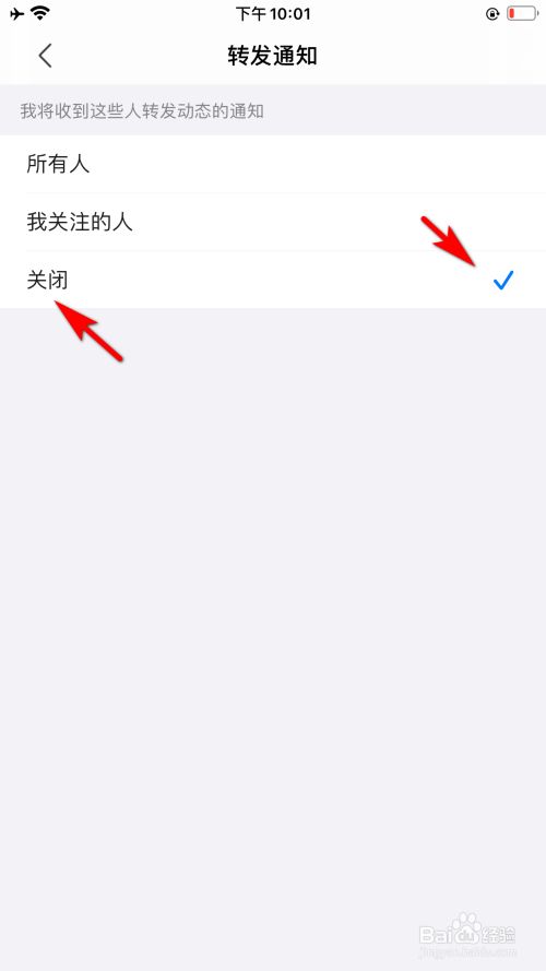 勾选封闭的选项,即可设置不再推送小我动态被别人转发的通知。