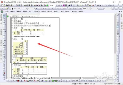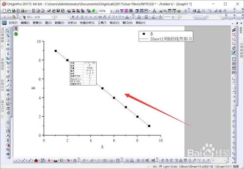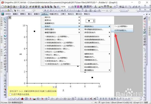 在散点图中点击【阐发】-【拟合】-【线性拟合】-【打开对话框】。