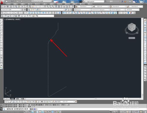 点击【前视】图标,切换到前视图界面。点击【直线东西】绘制出图示线段后,点击【圆弧东西】绘制出图示圆弧线(如图所示);