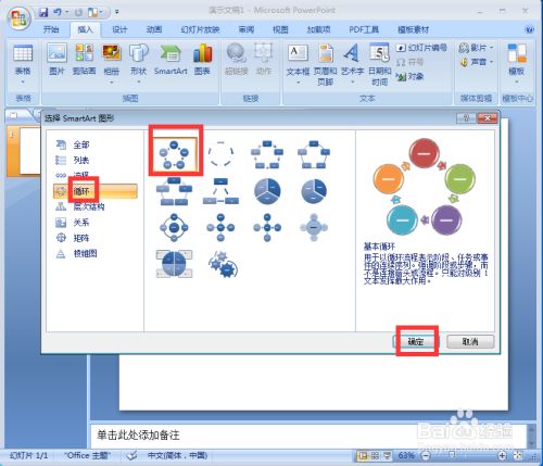 在选择smartart图形页面找到轮回,点击根基轮回,按确定;