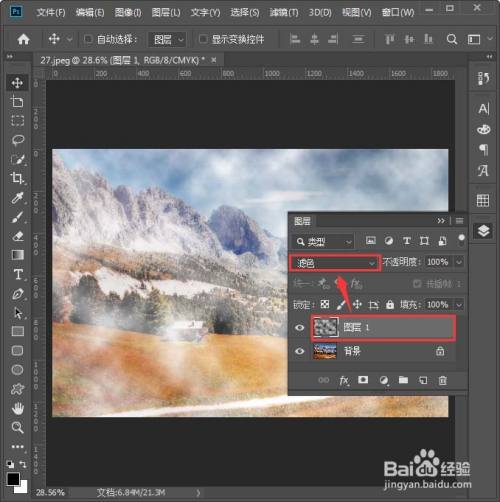 云彩调整好合适的大小之后,我们把它设置为【滤色】,这样云雾结果就出来了,如图所示。