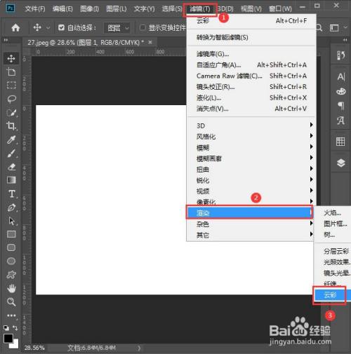 接着,我们选中填充白色的图层,在【滤镜】中找到【衬着】选择【云彩】,如图所示。