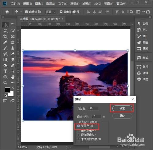 接下来,我们在拼贴里面选择布景色(若是前景色是白色的,则要选择前景色)点击【确定】,如图所示。