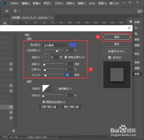 我们在图层里给图片添加一个紫色的投影,可按照本身的需要调整参数,点击【确定】,如图所示。