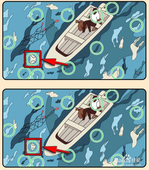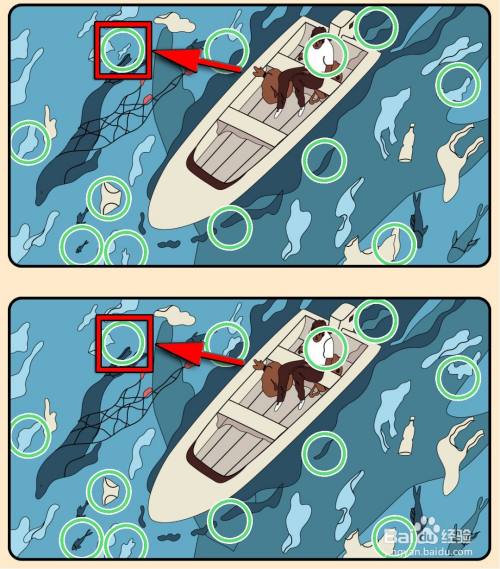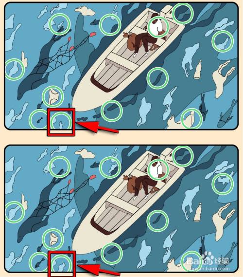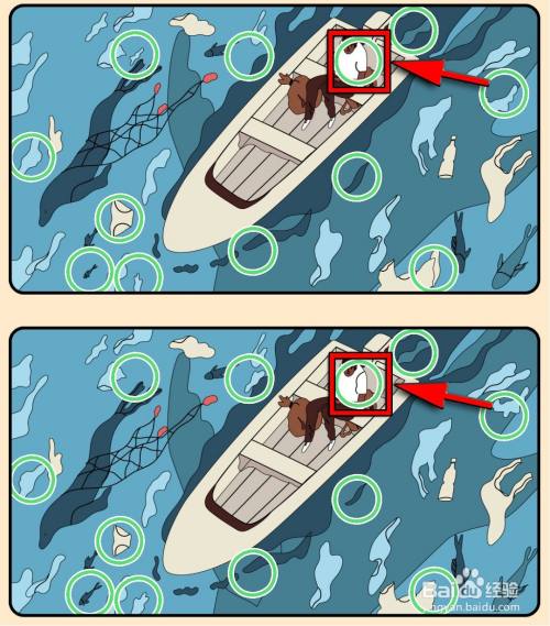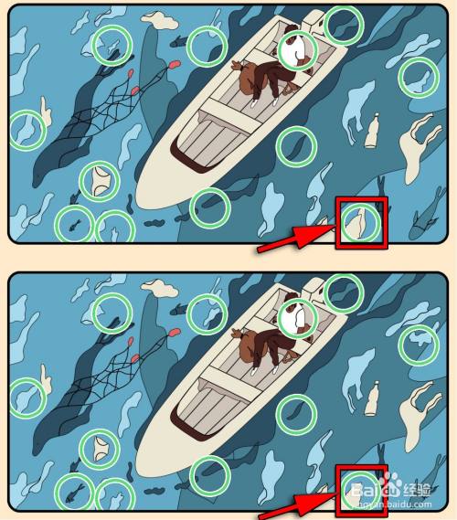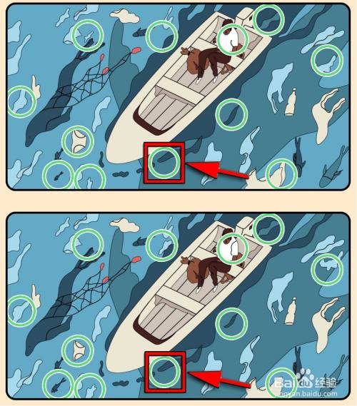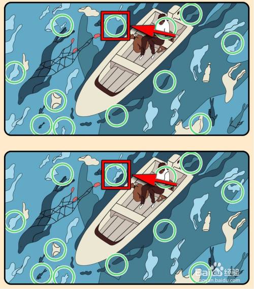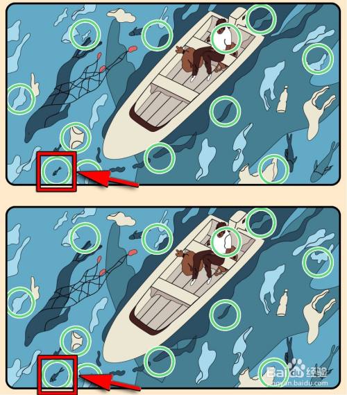 上图漂浮的物品较大,下图漂浮的物品较小。