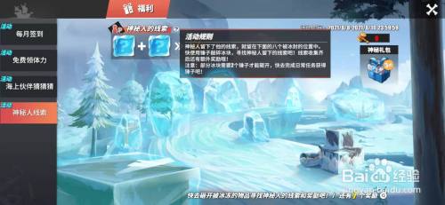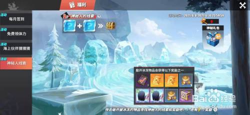 工具/原料华为mate40EMUI12帆海王热血航路10.12.0.8方式/步骤1进入游戏,选择福利。2点击神秘人线索。3注重线索被冰封了,需要锤子敲破冰块才能获得线索。锤子可经由过程日常使命获得。4奖励有经验书,战意卡,荷包等。END注重事项若是对大师有效,请大师用您可爱的小手手点个赞呗~~存眷我,进修更多攻略。