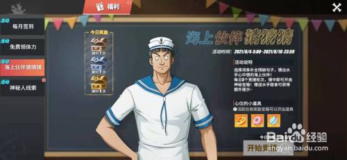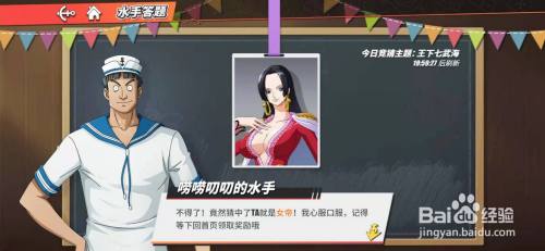 工具/原料华为mate40EMUI12帆海王热血航路10.12.0.8方式/步骤1进入游戏,点击福利,选择海上伙伴猜猜猜活动。2点击竞猜,依次选择有两个妹妹,吃过颓丧之果,代表动物是蛇。3点击提交谜底,显示她就是女帝,返回领取奖励即可。注重天天只能介入三次竞猜哦!END注重事项若是对大师有效,请大师用您可爱的小手手点个赞呗~~存眷我,进修更多攻略。