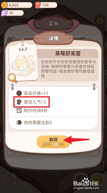 找到肆意菜品,点击【解锁】,快速增添酒店人气值。