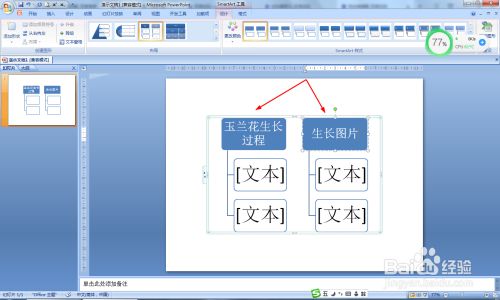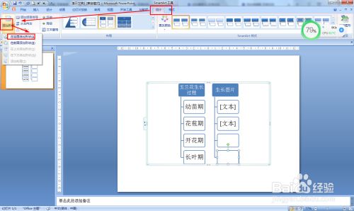 在左侧输入玉兰花发展的每个过程——不敷外形输入就点击SmartArt东西——设计——添加外形——在后面添加外形。