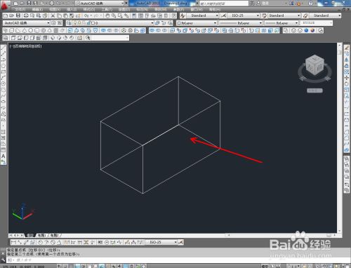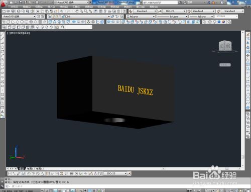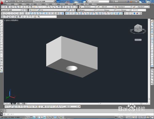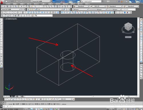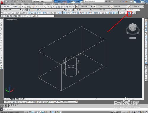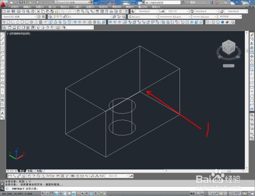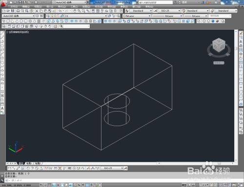 切换到西南视图,点击【长方体东西】绘制出一个长方体模子后,点击【圆柱体东西】按图示绘制出一个圆柱体模子并调整好两模子间的位置关系;