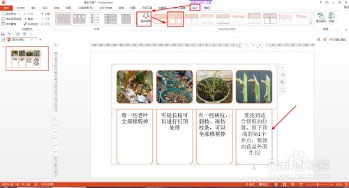 继续粘贴修剪图片——在文本框输入:要找到适合修剪的位置,留下顶端的第1个芽点,要朝标的目的花盆外面发展——设计——更改颜色。