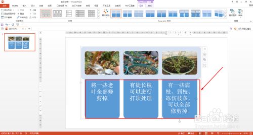 点击第一个图片下的文本框,输入:将一些老叶全数修剪失落——继续点击其它文本框输入修剪月季的步调文字申明。