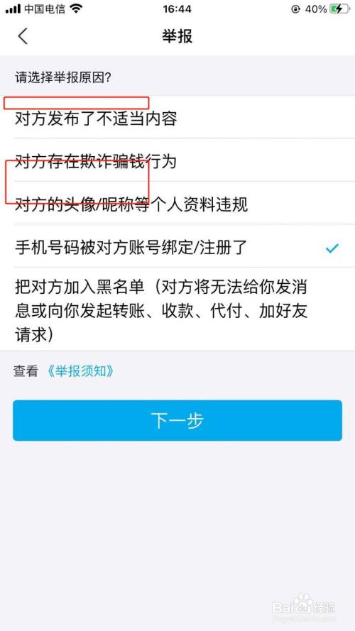 在打开的页面中按照提醒选择账号违规类型,并点击“下一步”即可