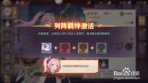 工具/原料苹果 7 PlusiOS 14.4.2三国志幻想大陆 1.9.311.前去声势1在手机桌面中,点击“三国志幻想大陆”游戏图标。2在“三国志幻想大陆”界面中,点击图中的“声势”图标。END22.激活武将排阵羁绊1在“声势”界面中,点击左侧的“+”号。2在“武将改换”界面框中,选摘要添加到声势的武将。3把武将添加到声势后,显示“排阵羁绊激活”提醒即可。END