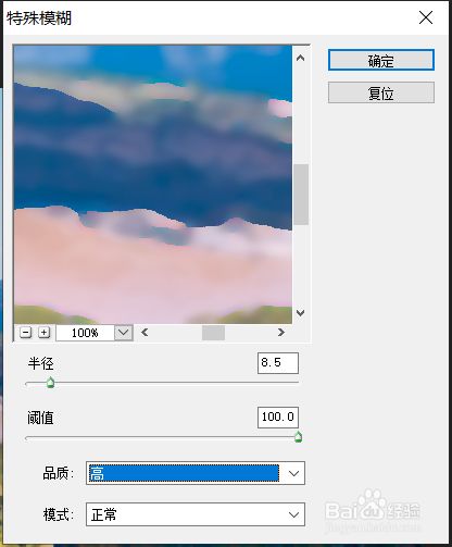 滤镜库-特别恍惚,恍惚半径设置为8.5,阈值设置为100,品质下拉框中选择“高”。