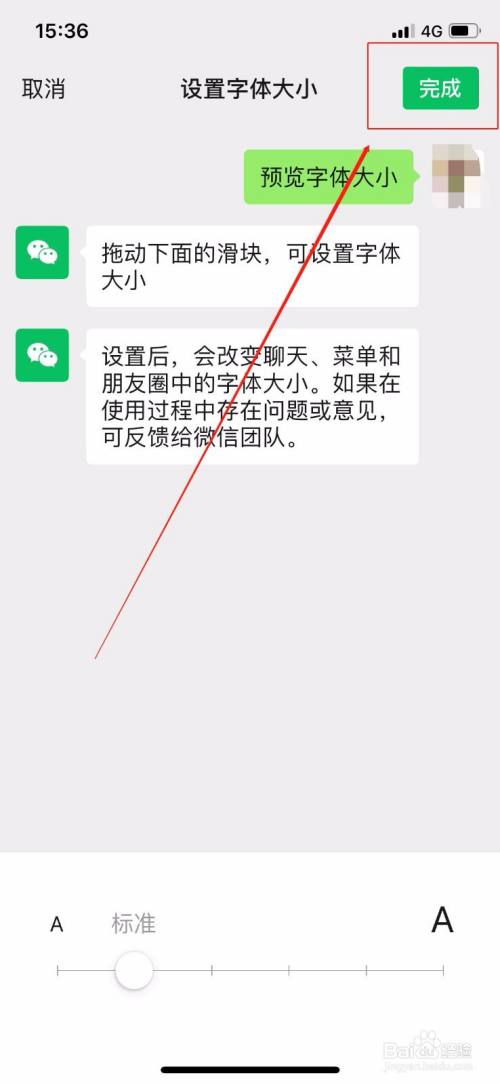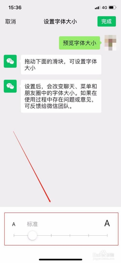 - 总结:微信字体大小设置--打开微信--点击我--设置--通用--字体大小--拖动滑块--完当作