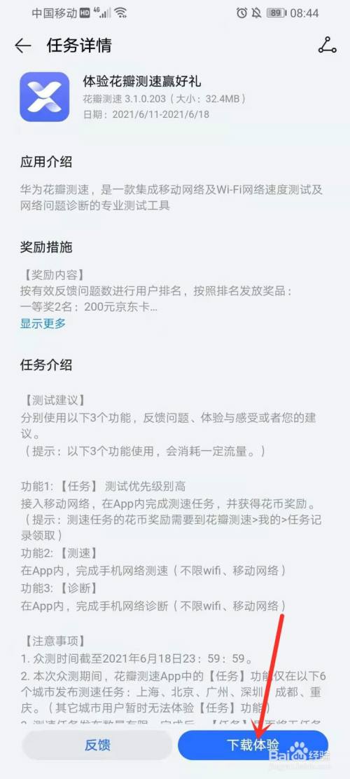 进入使命广场界面,找到“体验花瓣测速赢好礼”,点击进入详情页。