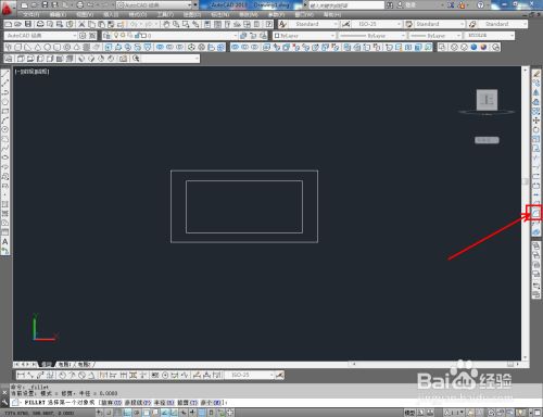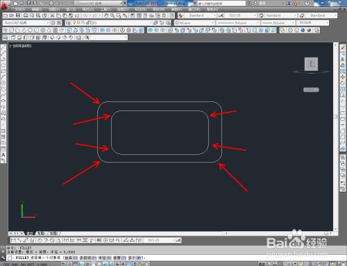 点击右边东西栏中的【圆角东西】,在号令栏中输入半径:5并按下空格键确认后,对两矩形图案进行圆角化处置;