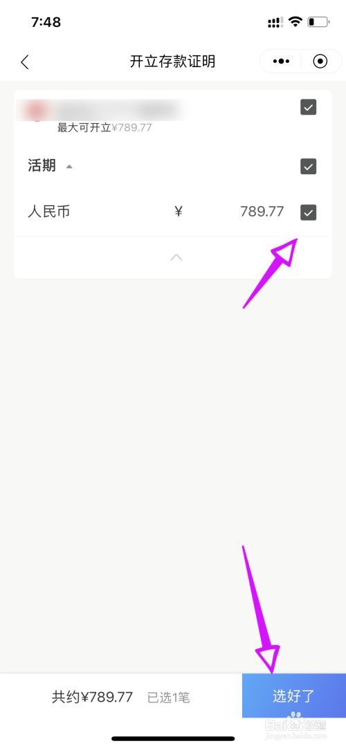 查看开立存条目证实的账户和金额后点击“选好了”。