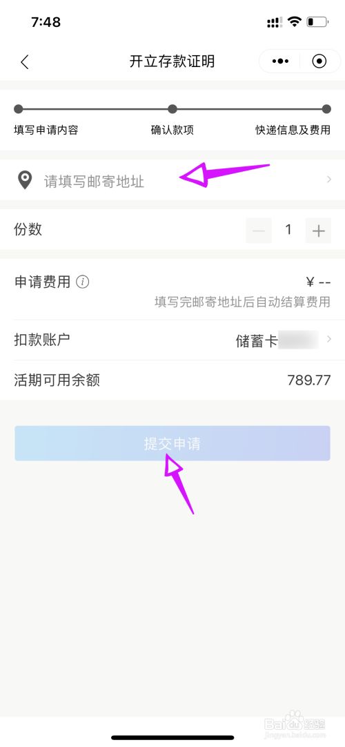 再输入邮寄开立存条目证实单后点击“提交申请”。