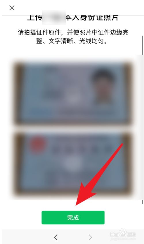 进入到证件上传界面,上传有用的身份证件,并点击“完当作”按钮,即可。