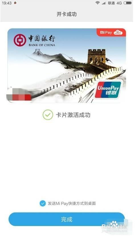 完当作之后会显示【卡片激活当作功】,把Mi Pay快捷键添加到桌面,点击【完当作】即可。
