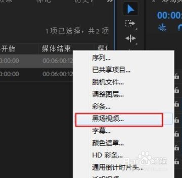 点击新建项,选择黑场视频, 将其插入到字幕层和视频层中心。
