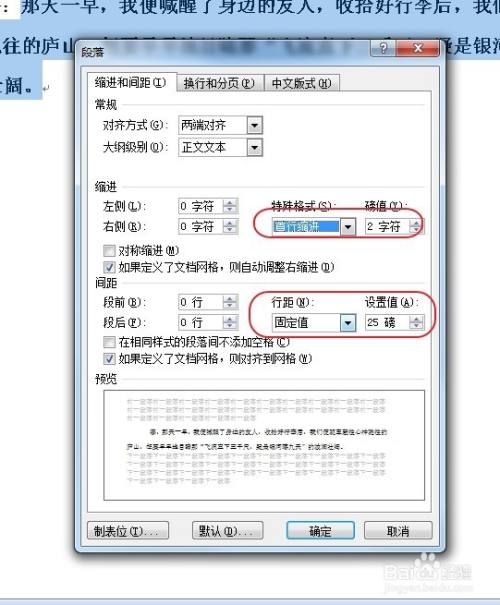 接着便会弹出“段落”设置窗口,一段内容的首行需要空两行,所以要将首行设置当作缩进2字符,行间距设置为固定值25磅或者单倍行距即可。