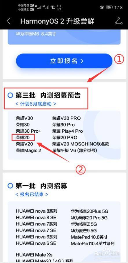 可以看到第二批进级鸿蒙系统的手机型号,正在进行内测报名,报名当作功的就可以进级鸿蒙系统(图片中圈红的部门)