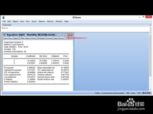 别离成立新残差序列(E)对各诠释变量(X,X^2,X^(1/2),X^(-1), X^(-2),X^(-1/2))的回归模子:LS E C X
