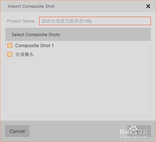 我们还可以从本来的项目中直接导入合当作镜头,这样原项目无需将合当作镜头先导出。在“Media窗口”内,右键空白处依次选择“Import->Composite Shot…”,选择后缀名为“*.hfp”的项目文件,此时会弹出选择合当作镜头的选项窗口,可以复选内容进行导入操作。导入之后将在“Media窗口”中建立一个新文件夹,合当作镜头所需的素材都将被导入并放置在该文件夹中。