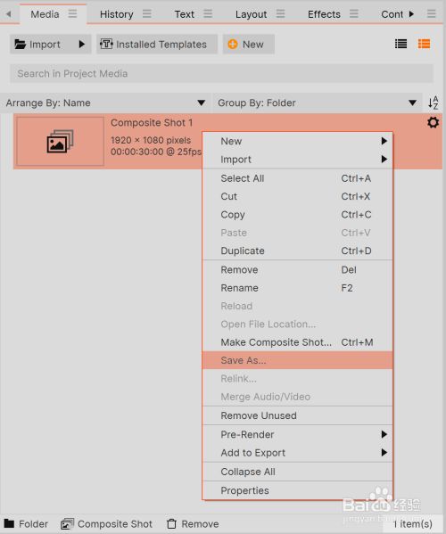 我们在“Media窗口”,右键空白处依次选择“New->Composite Shot…”,或者在窗口底部点击“Composite Shot”图标,还可以经由过程“Ctrl+Shift+N”快捷键体例建立合当作镜头。