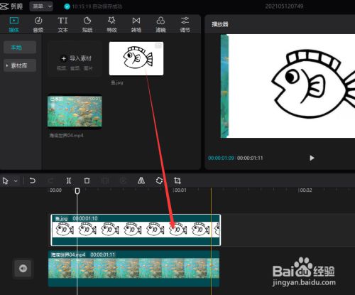 从媒面子板可以再标的目的时候轴本家儿视频轨道上方添加一段视频素材,或者利用剪映帖贴纸库中的素材也可以,如图所示。