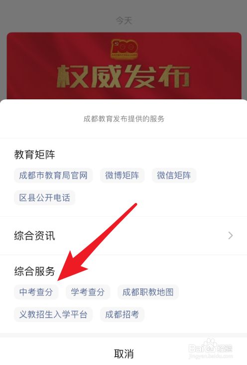 在弹出的窗口中,找到“中考查分”,点击它。