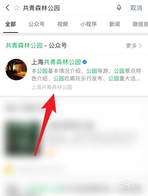 在微信搜索框中,输入“共青丛林公园”,进行搜刮。