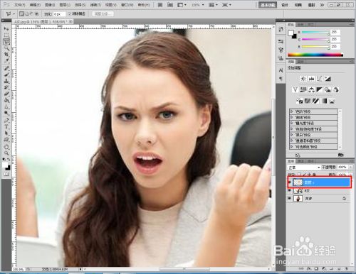 点击【多边形套索东西】,按图示框出图片人物脸部区域,建立去脸部选区。按下键盘【CTRL】+【J】,复制出选区部门后,将图示图片埋没;