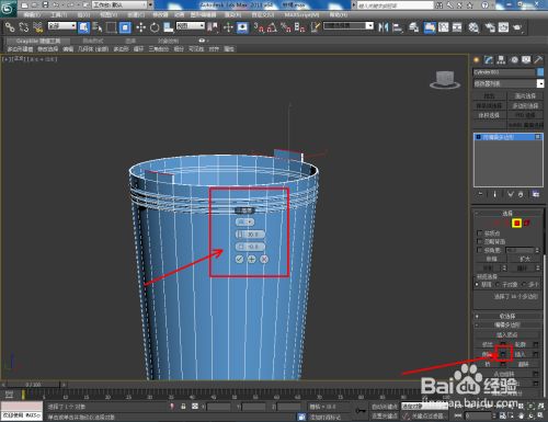 点击【多边形】图标,选中图示模子上的面后,点击【倒角】右边的小方框并设置好倒角参数(如图所示);