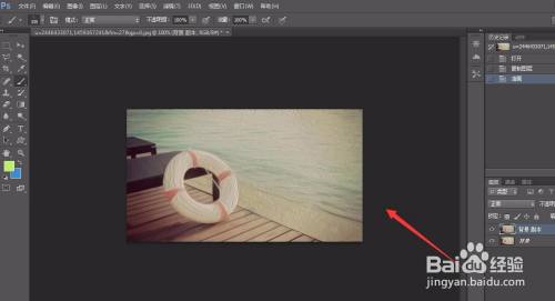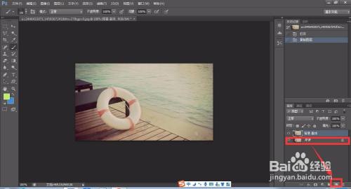 我们在电脑页面右下角找到图层面板,按住布景图层将其拖动到小编框选的图标上再松开鼠标,即可获得复制图层,我们之后的操作将在复制图层上操作。