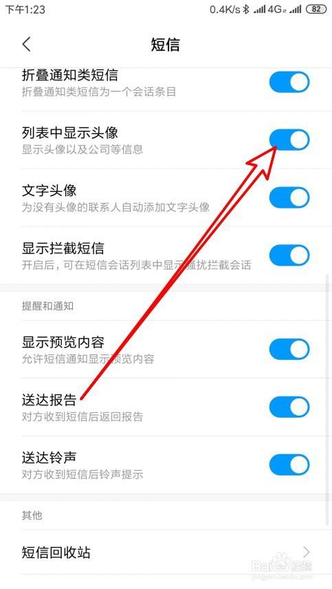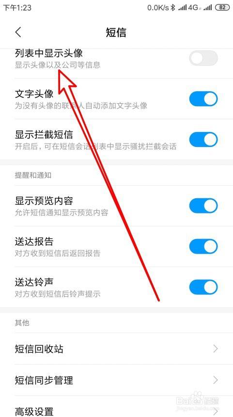 然后在打开的短信设置页面找到列表中显示头像的设置项。