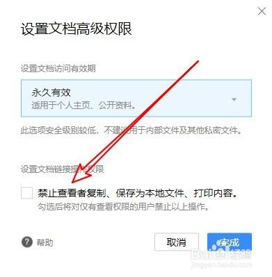 接下来在打开的高级权限页面找到禁止查看者复制、保留为当地文件、打印内容设置项。