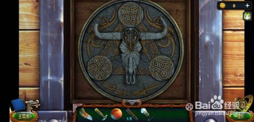 箱子上还有一个圆形牛头拼图,如图所示。把这些碎片拼当作一幅完整的牛首浮雕,即可打开箱子第二层盖子。