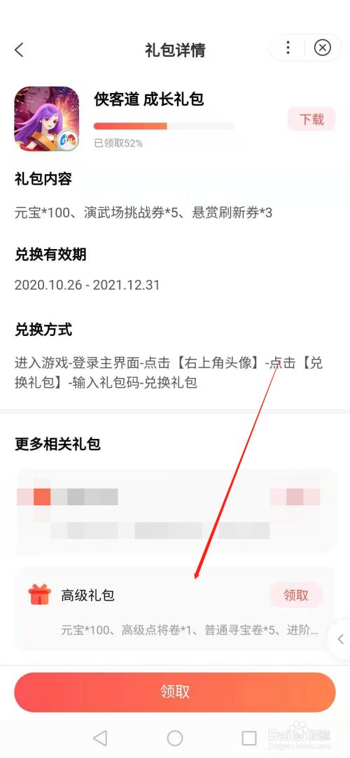进入“礼包详情”页面后,里面有具体的礼包内容,兑换体例等信息,领取后到游戏里兑换即可,如下图所示: