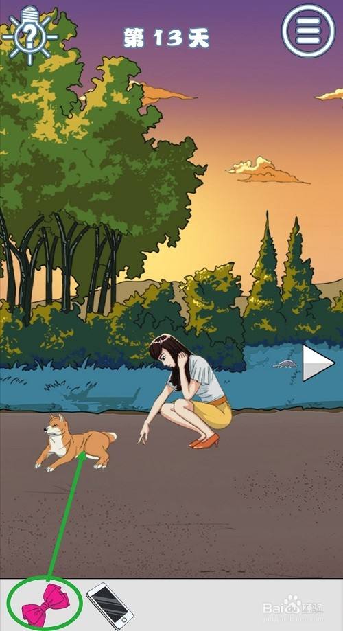 在左侧场景,点击捡起【手机】,再把【蝴蝶结】拿给小黄狗。