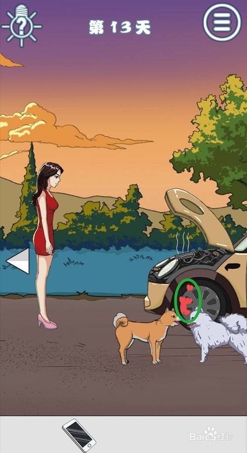 小黄狗跑到小白狗那边后,点击获取【红心】,然后到左侧场景,把手机给女友,让她打德律风给男友。