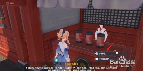 工具/原料小米10MIUI12.1原神2.0方式/步骤1运行原神,进入游戏界面,来到鸣神大社,找到玄冬林擒,点击进行对话。2然后点击求签,获得竹签。3再和玄冬林擒进行对话,交付竹签,进行解签。4当解签为凶时,即可告竣诸事不宜当作就。END