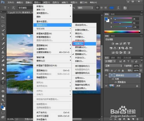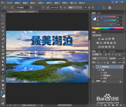 点击文字东西,将文字颜色设为蓝色,输入最美湖泊;