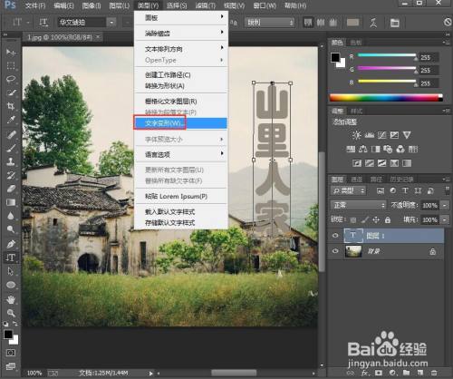 点击文字东西,选择灰色,输入山里人家;
