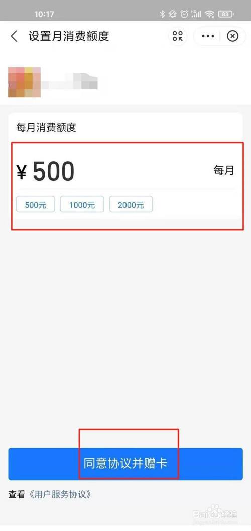 6、设定消费上限,点击赞成和谈并赠卡即可。