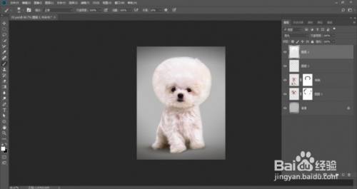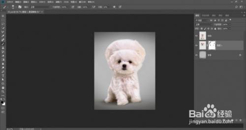 选择狗狗图层,单击添加图层蒙版按钮建立蒙版,用柔角画笔东西在狗狗头部的边缘涂抹黑色,使其与后面的头像能融合在一路: