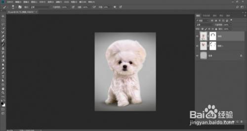 单击图层面板底部的“添加图层蒙版”按钮,为图层1建立蒙版,用柔角画笔东西在狗狗的耳朵边缘涂抹黑色,将其埋没